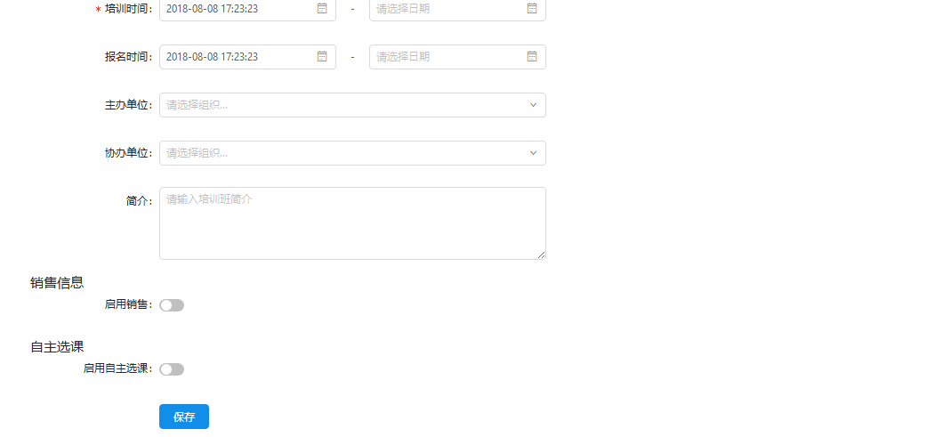点击"创建培训班",进入培训班创建页,填写必填项(*为必填项),点击"确定"培训班创建成功。