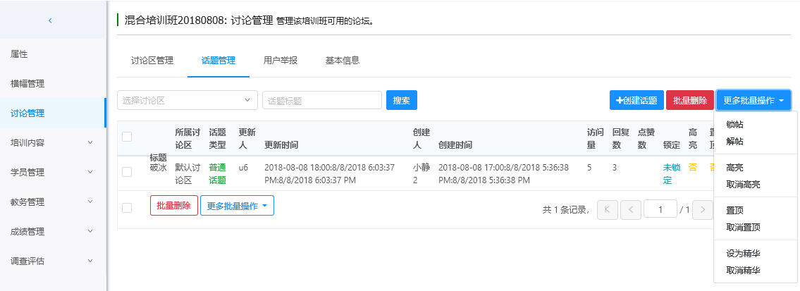话题管理:可以对话题进行锁贴、解贴、高亮/取消高亮、置顶/取消置顶、设为精华/取消精华、删除/批量删除等操作。