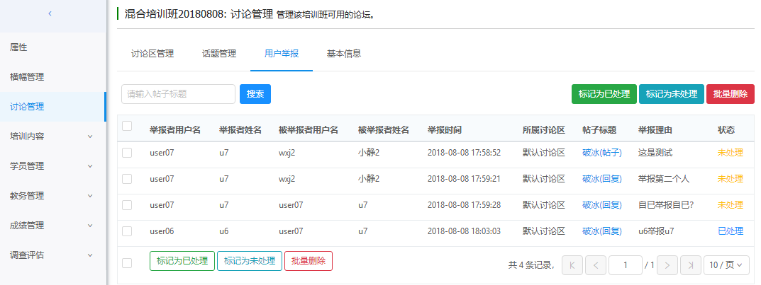 查看发贴、回贴被用户举报的情况,可以对举报信息进行处理,处理后,该贴子或回复内容不再显示出来。