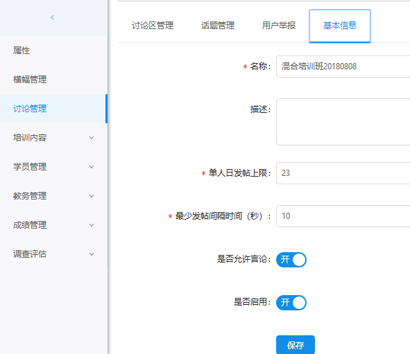 班级成员交流的区域。可以维护讨论区的基本设置、话题管理、查看用户举报等。