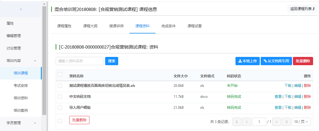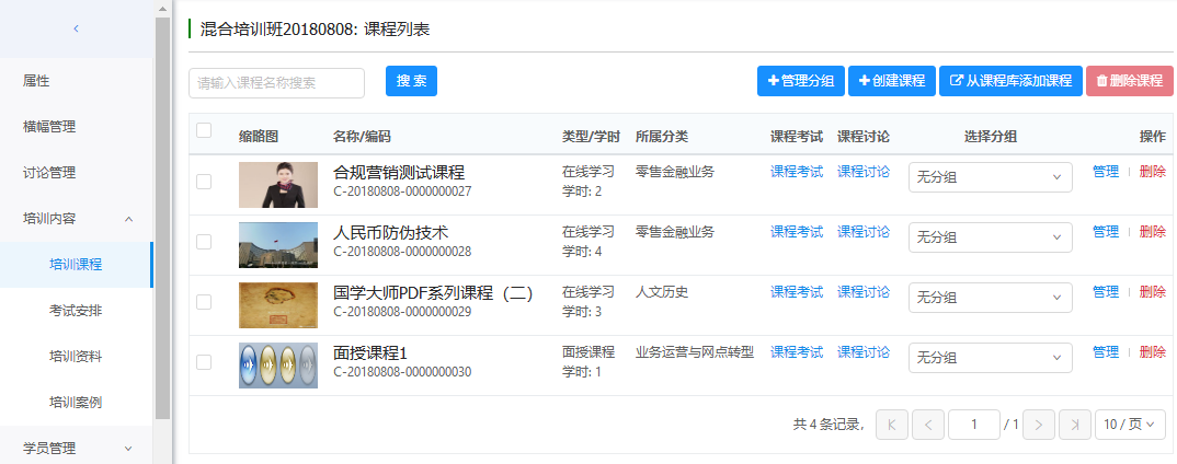 支持创建课程(手工创建、从课程库添加课程)、管理培训班内的课程分组、删除课程、管理课程、添加课程考试、添加课程讨论等操作。