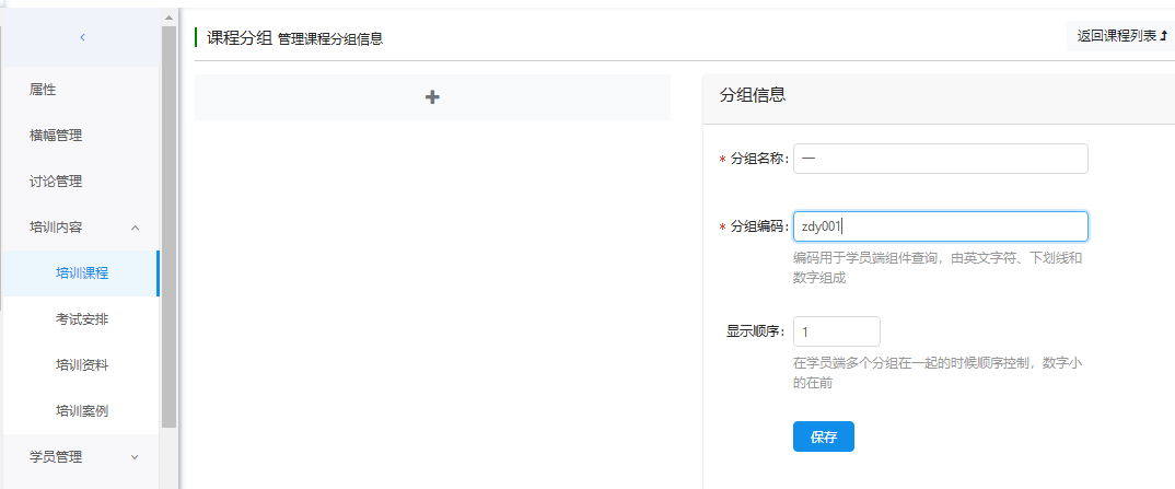 在培训班课程列表页面,点击'管理分组',设置培训班内课程的分组,点击'保存'。