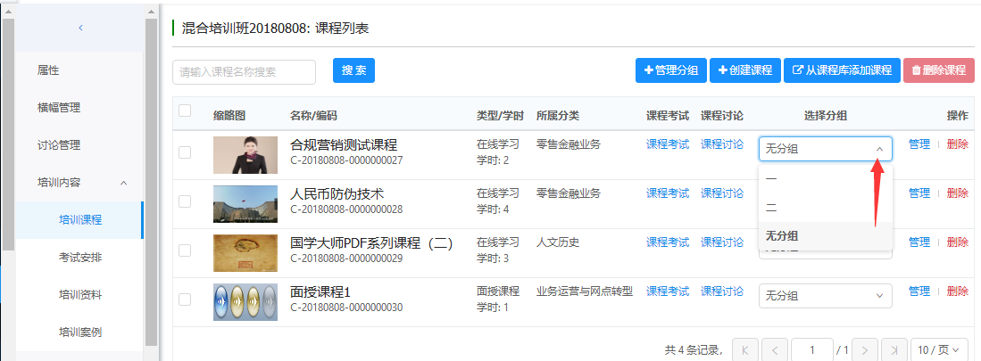 分组维护后,可以在课程列表中,展开选择分组,为培训班中的课程指定分组。