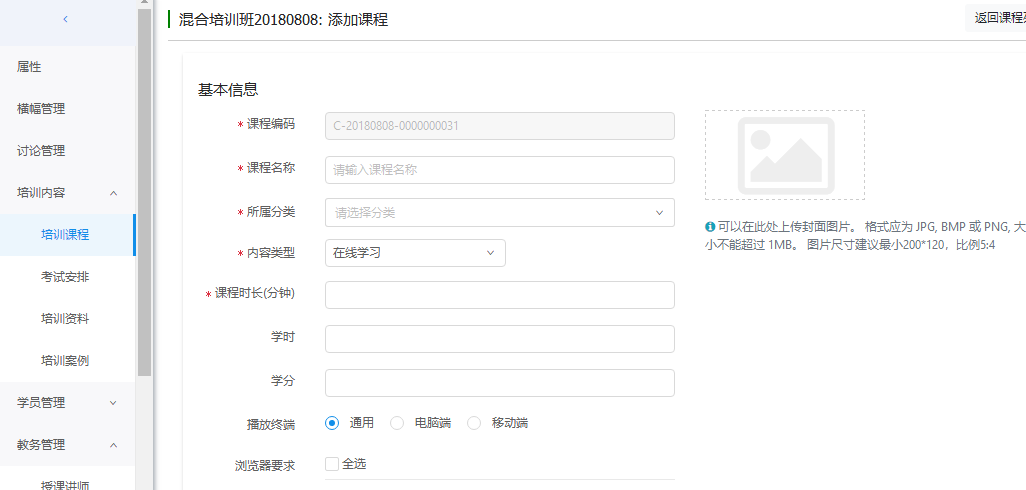 在培训班课程列表页面,点击'创建课程',进入课程属性页面,输入必填项,点击'保存'。返回到培训班课程列表页面。