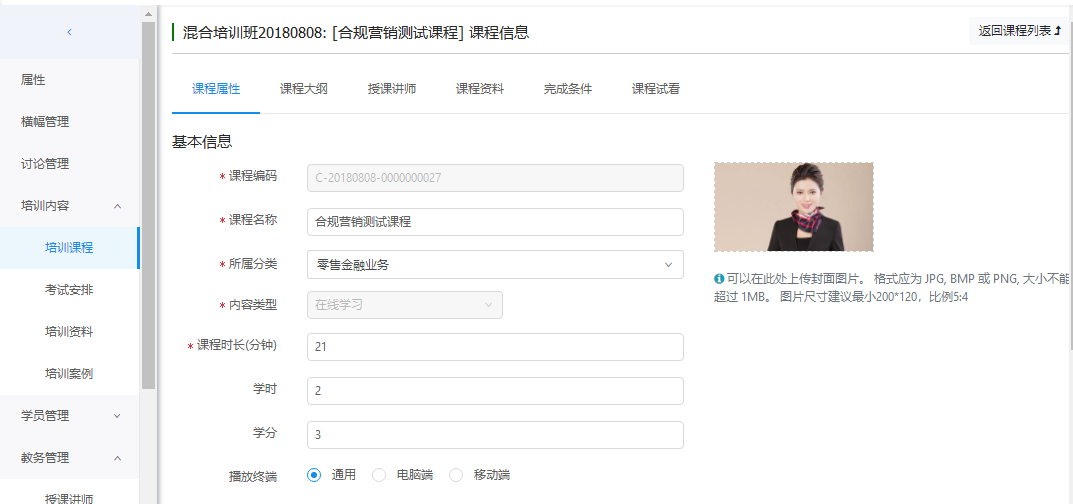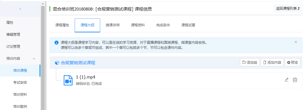 课程列表点击"管理",进入课程管理界面。包含课程属性、课程大纲、授课讲师、课程资料、完成条件等。默认显示课程属性页面。