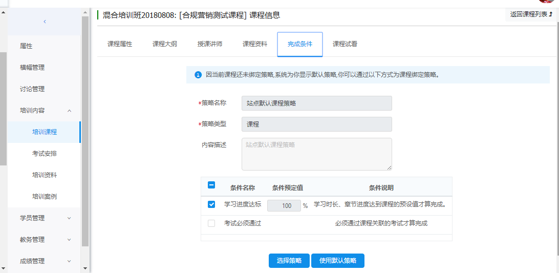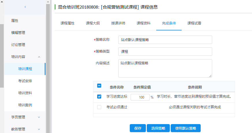 课程的完成条件,默认继承培训班所属组织的默认课程成绩策略,如果本级组织没有默认课程成绩策略,则向上继承,直至根结点。