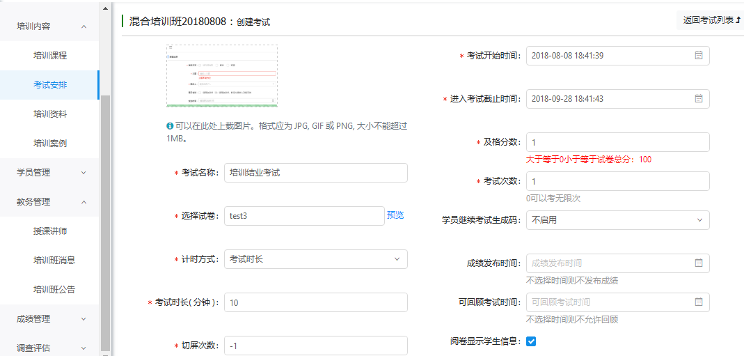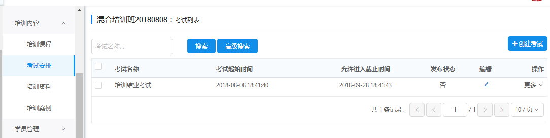为培训班添加的考试。支持按考试名称查询、按考试名称、创建人、发布状态、考试时间、创建时间高级查询。