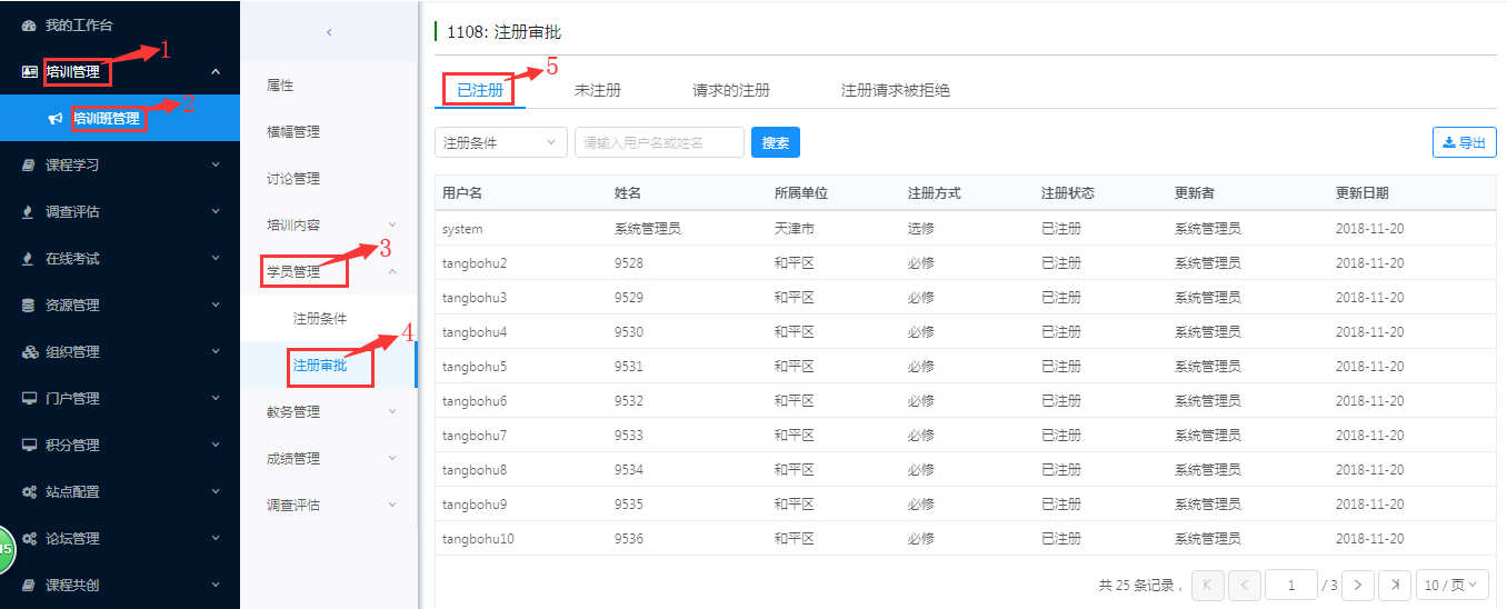 查看、审批培训班学员注册情况。
