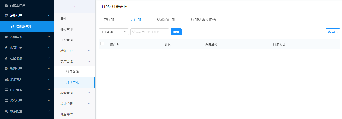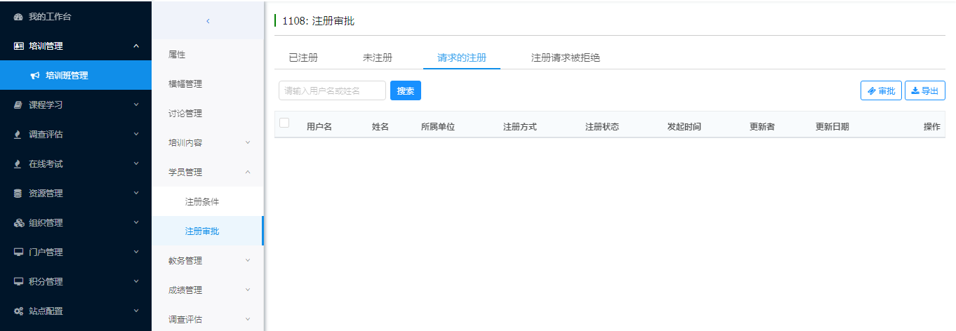 查看、审批学员的注册请求。可以导出选择的学员。