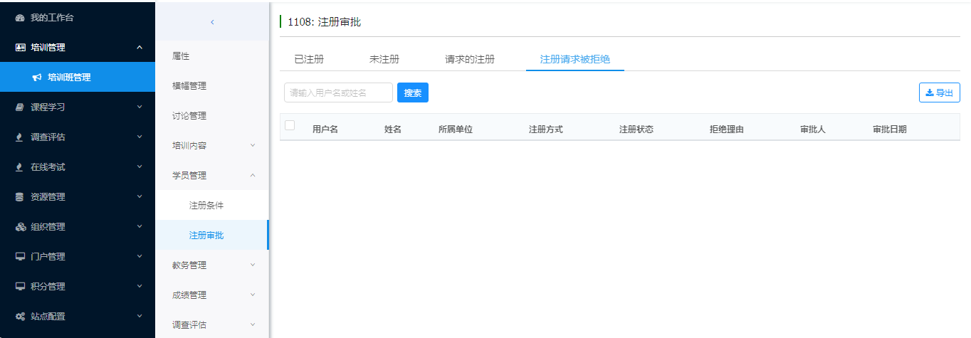查看被审批拒绝学员信息。可以导出选择的学员。