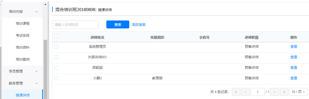 查看培训班中课程上的各个授课讲师。在讲师名称后面点击'查看',进入讲师详情页面。