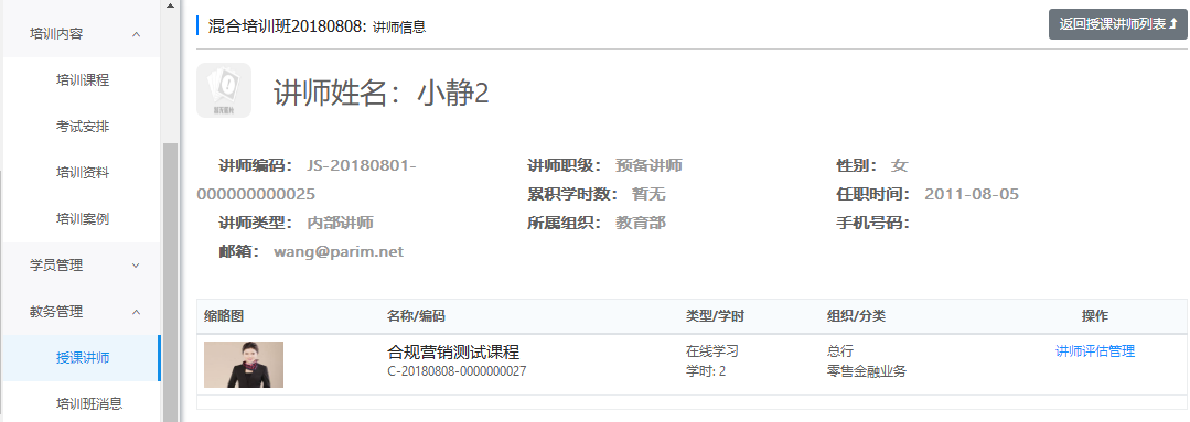 在讲师详情页面,查看讲师信息。点击'讲师评估管理',可以创建并管理讲师评估问卷。