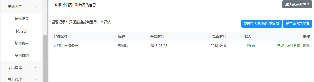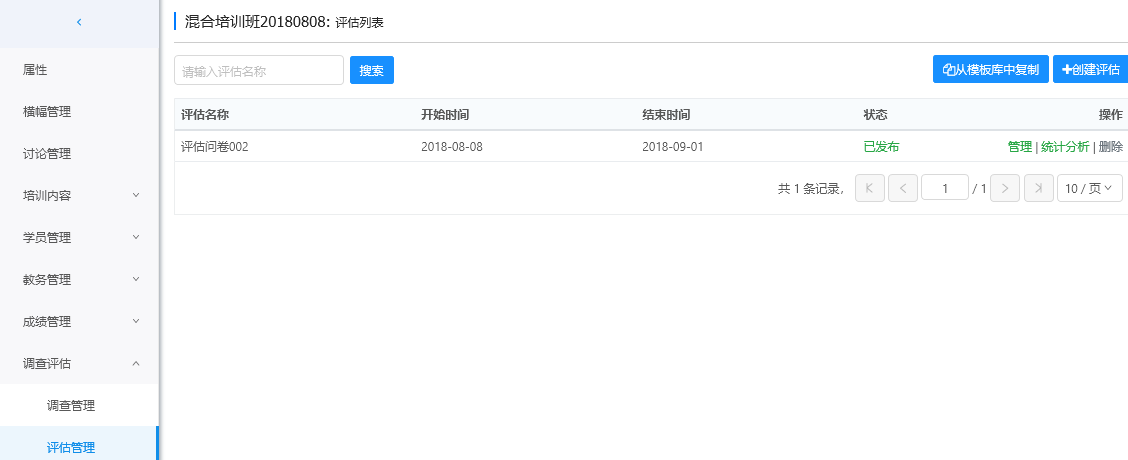 可以创建并管理培训班上的评估问卷。创建方式有两种,一是从问卷库中复制,一是在培训班中重新创建。