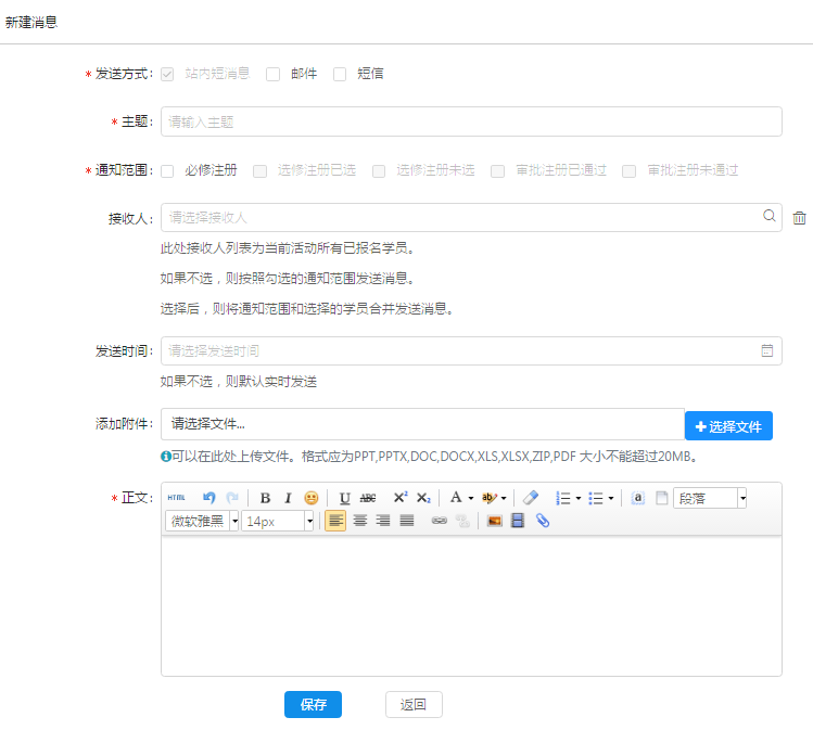 发送跟培训班相关的通知。发送范围自定义,发送方式包含站内消息(默认)、短信、邮件等方式。