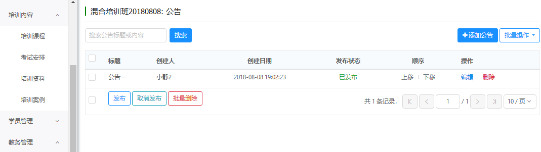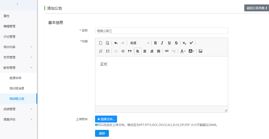 培训班公告列表点击'添加公告',进入公告编辑页面。