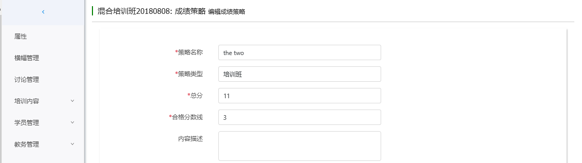 可以查看当前培训班成绩策略,修改培训班成绩策略。已勾选的策略维度占培训班总分的百分比之和要是100%。