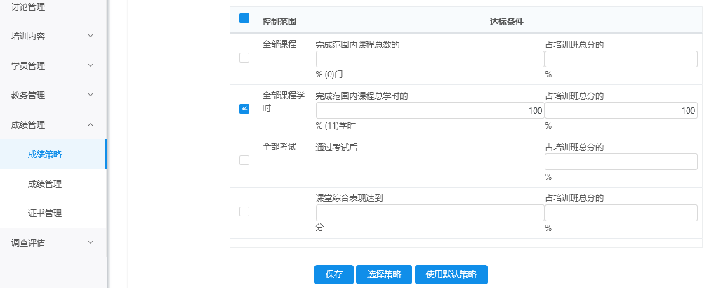 如果想修改课程成绩策略,点击'使用默认策略'或'选择策略',可以选择系统中站点或组织下更多的课程成绩策略,再根据课程完成情况,修改策略内容,点击'保存'。
