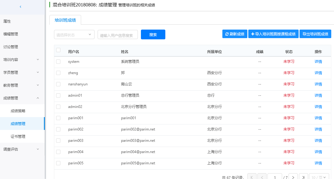 培训班成绩中可以查看学员学习进度和详情,系统默认每天自动更新一次培训班成绩,支持管理员实时刷新培训班成绩。可以导入培训班面授课程成绩、导出培训班成绩。