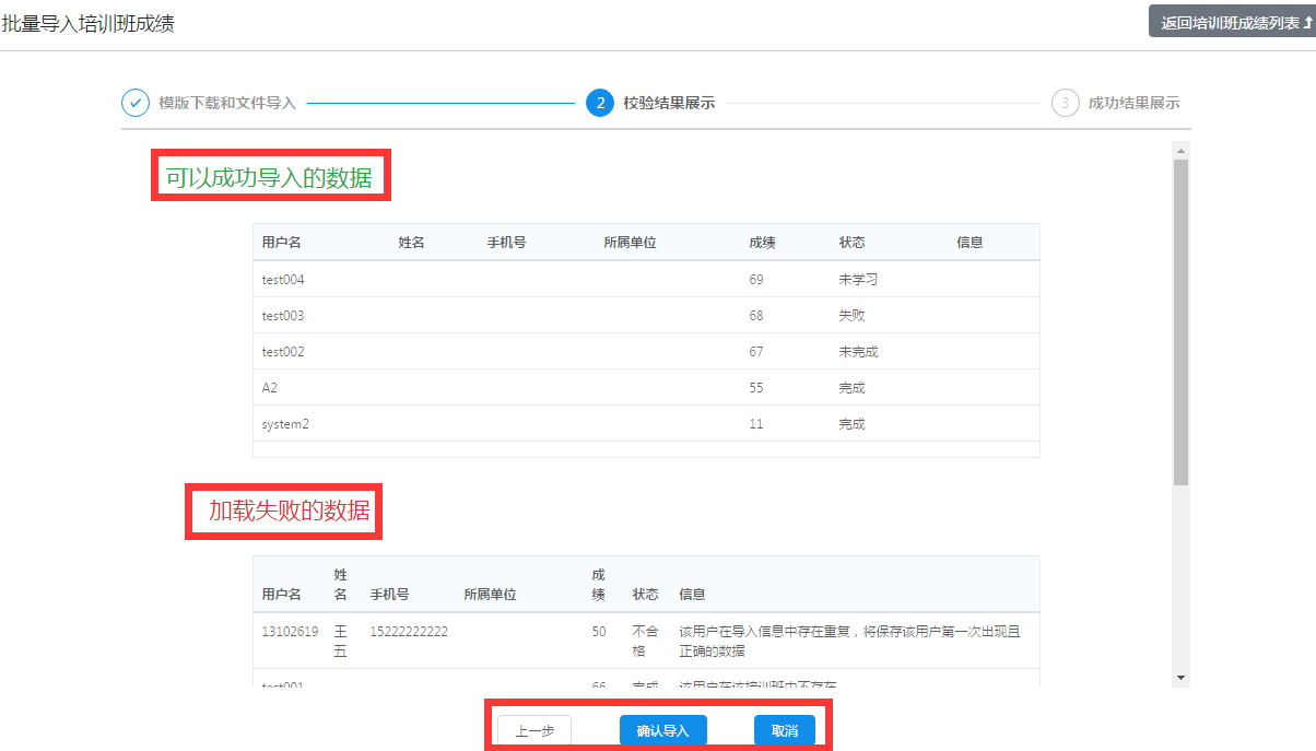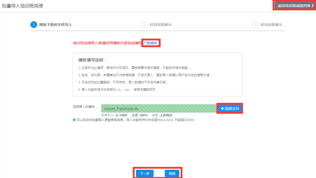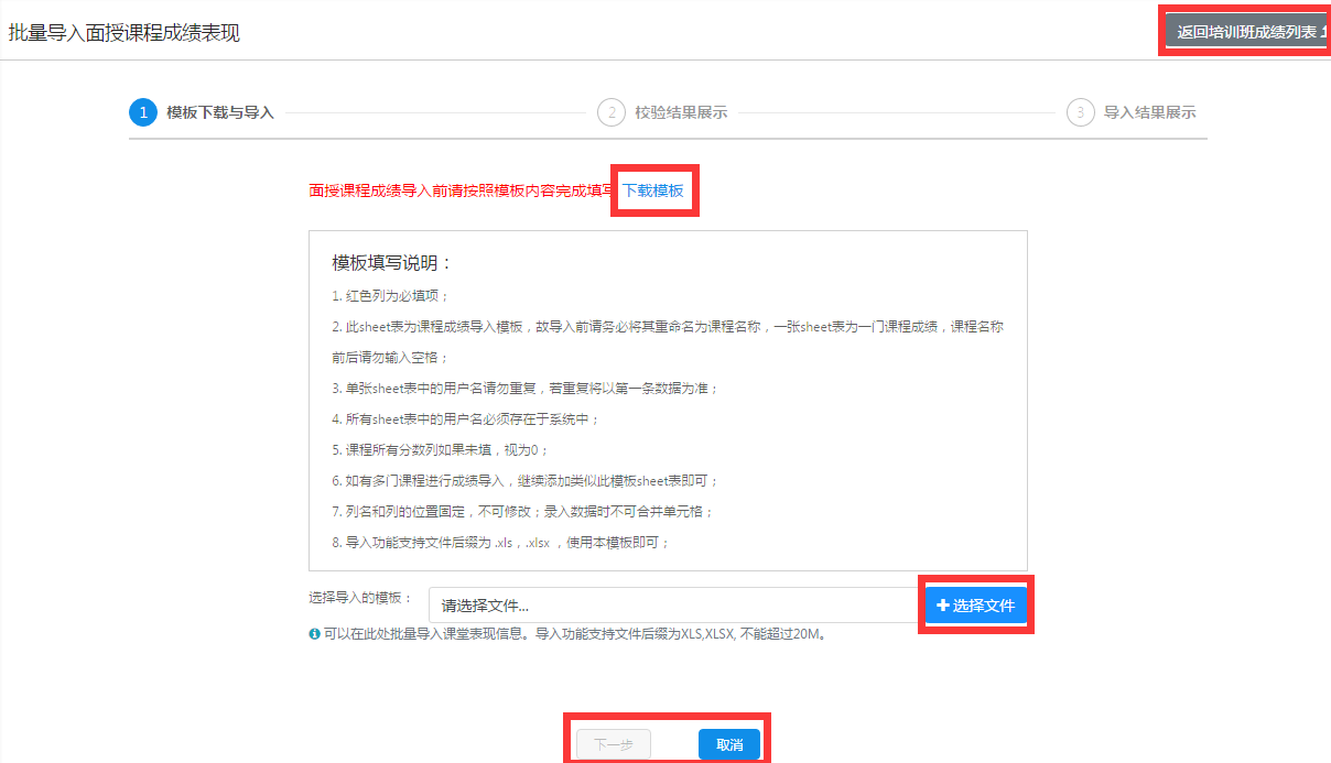点击"导入培训班面授课程成绩",进入到批量导入面授课程成绩流程界面。