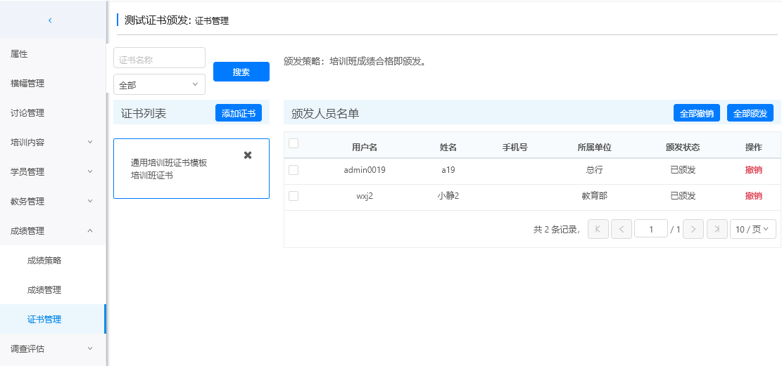 可颁发人员名单中显示培训班学习状态已完成的学员列表。勾选学员,点击'颁发状态',确认颁发。可以对已颁发证书的学员撤消颁发。